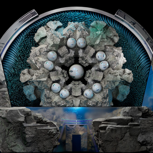the results are media installations, scenographic spatial designs and material realities through the fusion