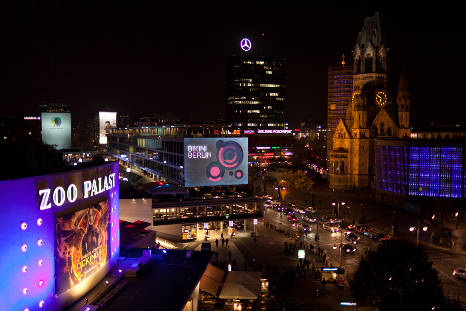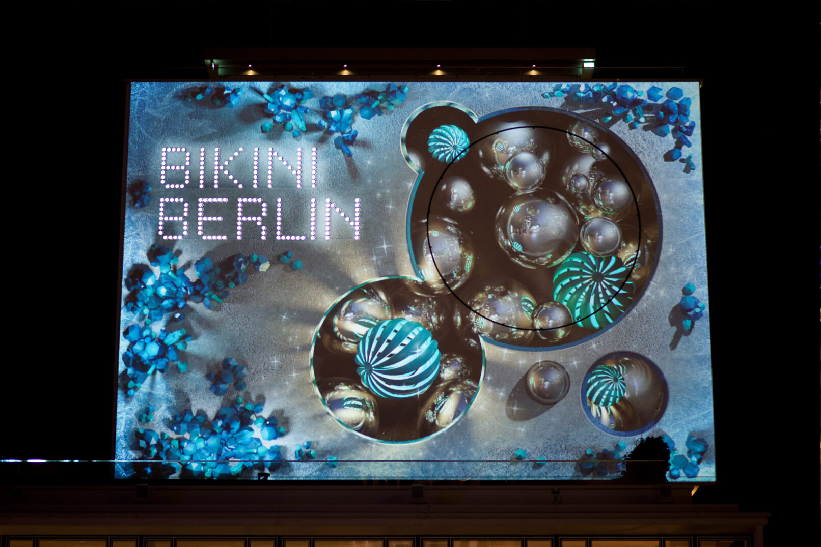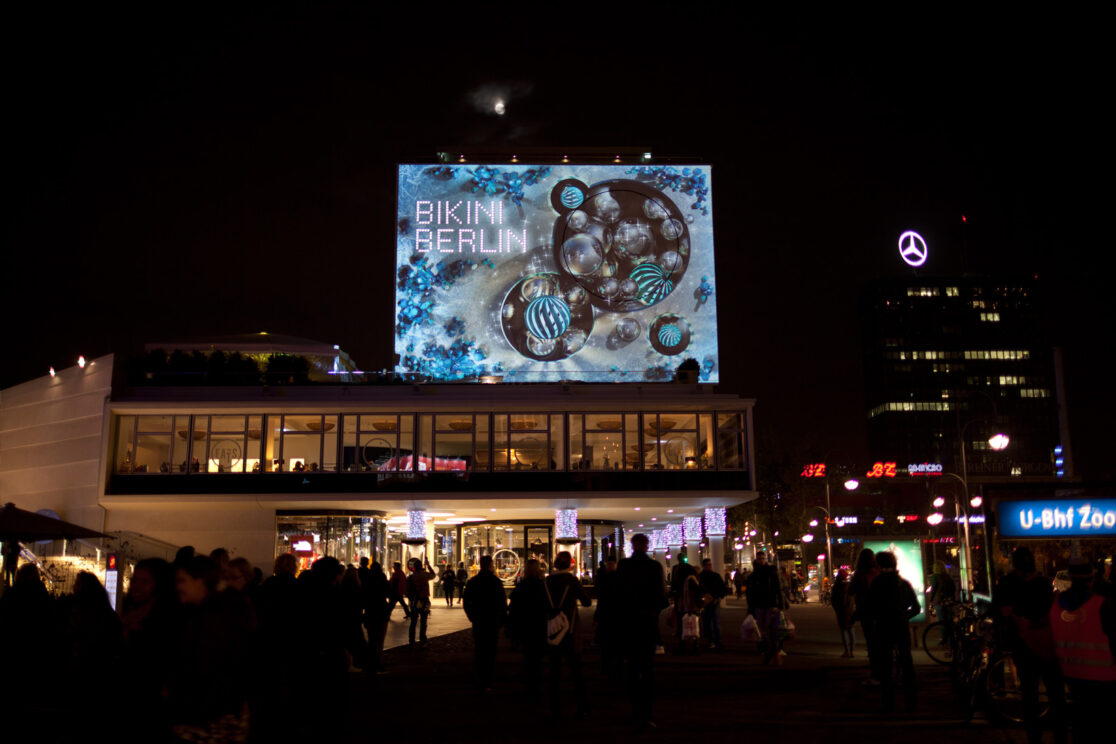 Bikini Berlin is the new cool kid in town – a concept mall for contemporary design and fashion in the landmarked „Bikini-House“ by Paul Schwebes und Hans Schoszberger. For the winter season 2014 we were asked to stage the front façade of the building complex with a festive light installation.The work is inspired by the corporate design of Bikini Berlin and turns the omnipresent „dot“ into a stage for vivid motion graphics. By picking up stylistic elements of Bikini’s winter decoration the piece offers a foretaste of the urban winter landscape inside the building.