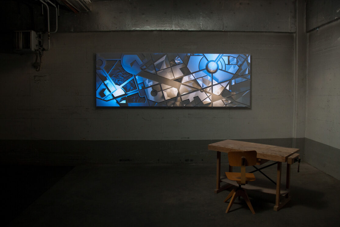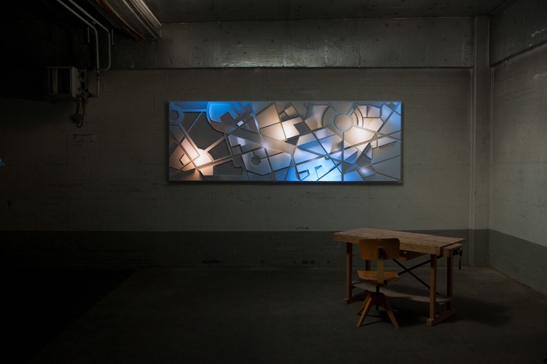 Inspired by the structure of city maps, the sculpture design works with simple geometric forms and different depth layers to create an abstract cityscape. Custom-fit video animations trace its surfaces and edges, ranging from subtle light animations to realistic 3D-transformations. The work was conceived to visualize the dynamics of urban development in a subtle way, while it explores the transitions between lighting design and motion graphics.