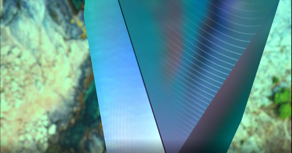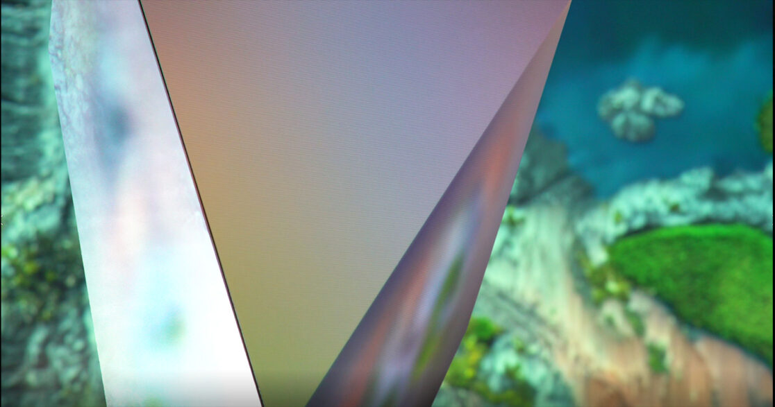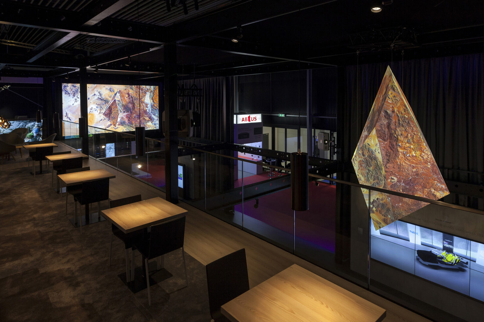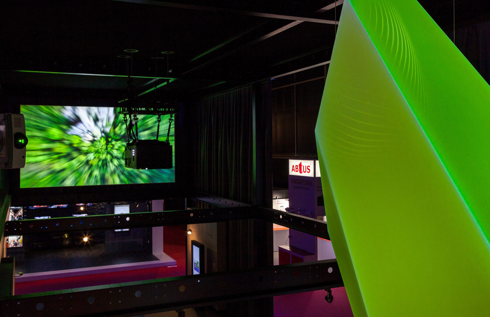 A floating polygon sculpture with an object-specific projection mapping was installed to correspond with a 4k-resoultion projection screen. The video content explores the structures of natural landscapes. It moves from distant aerial views into the very details, until the landscapes finally dissolve into abstract patterns and colours. The interplay of real-life footage and abstract video animations illustrates how modern imaging technology has mastered the task of displaying the beauty of nature while it demonstrates the remarkable imaging qualities of NEC’s projector range. At the same time, the extensive installation is an integral part of the booth design as its shifting colours, brightness and animation speed subtly influence the spatial atmosphere.