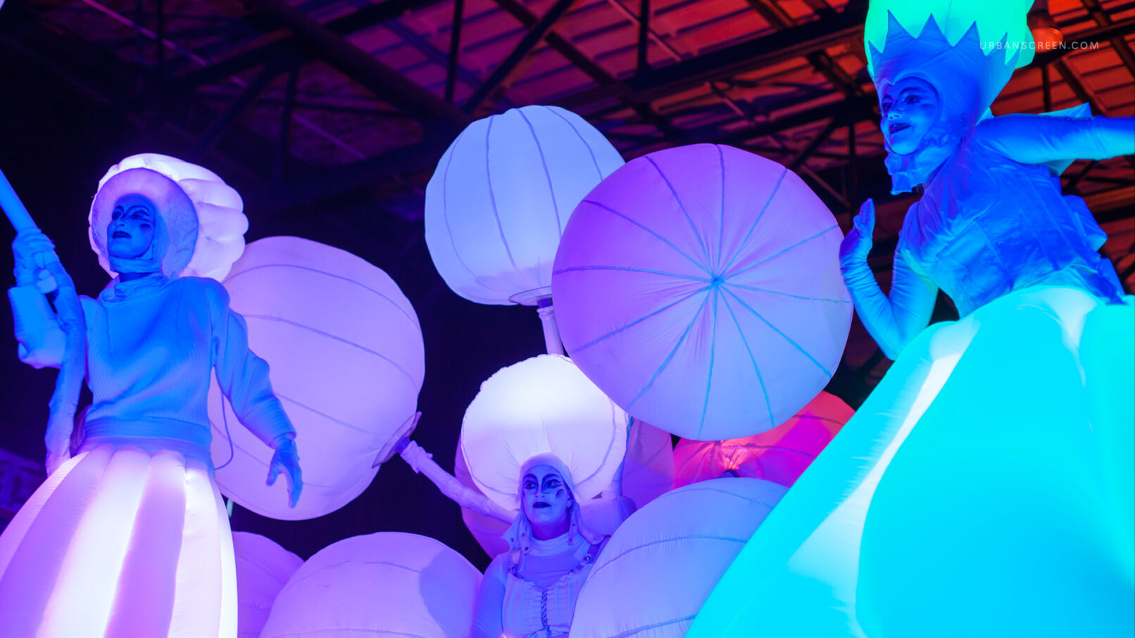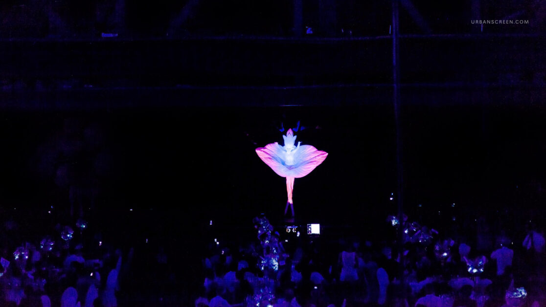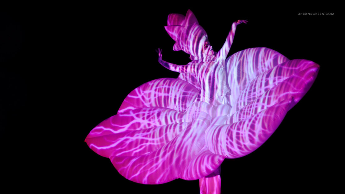 Four creative collectives from Bremen teamed up to create a realtime kinetic mapping performance for the Fleurop-Interflora World Cup 2015. In this site-specific performance, three stilt walkers in floral-inspired, partly self-illuminating inflatable costumes become moving projection surfaces. With a little help of Kinect-based motion tracking, vivid graphic animations are mapped onto the performers while they move about the monumental hall freely.