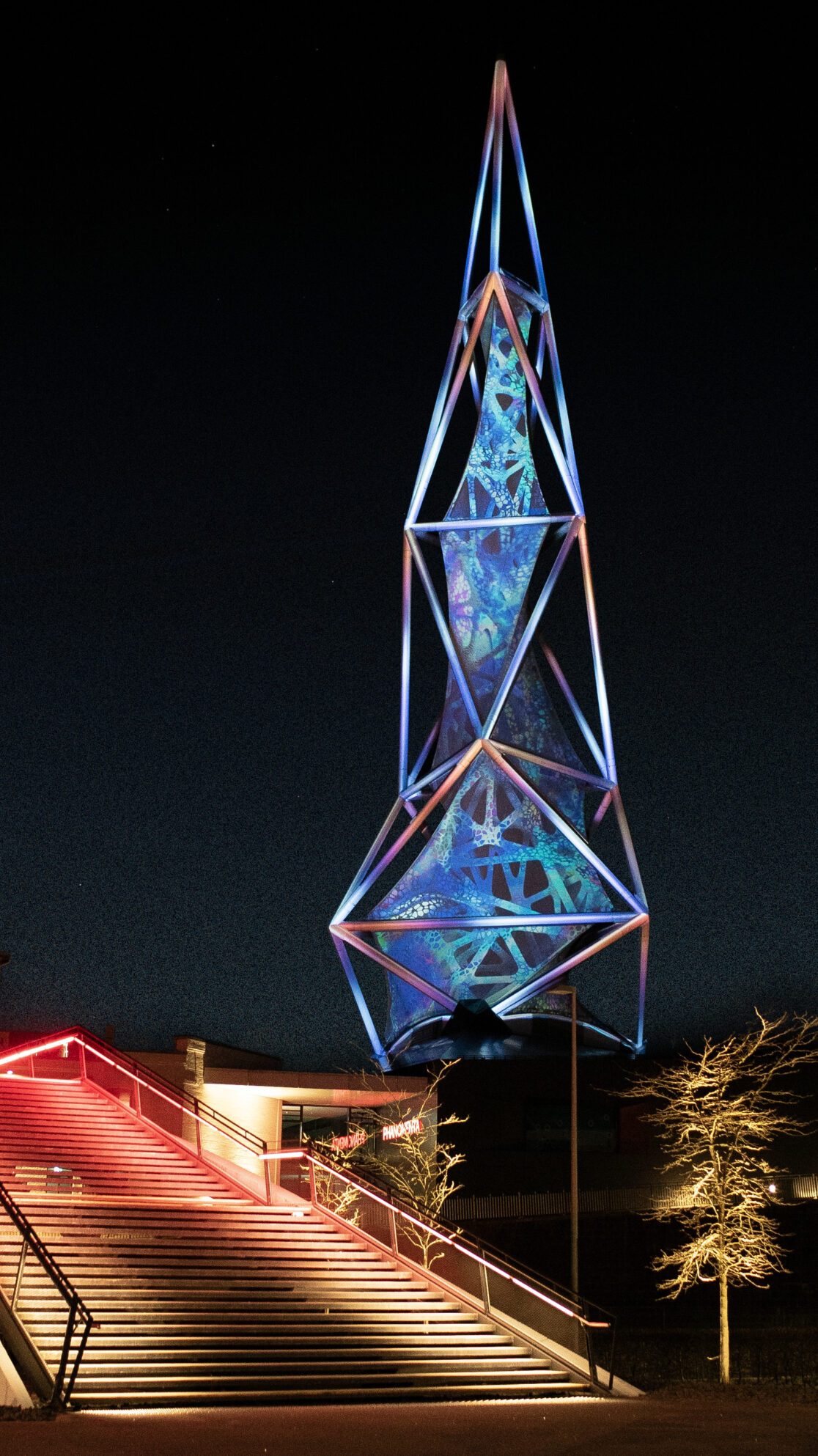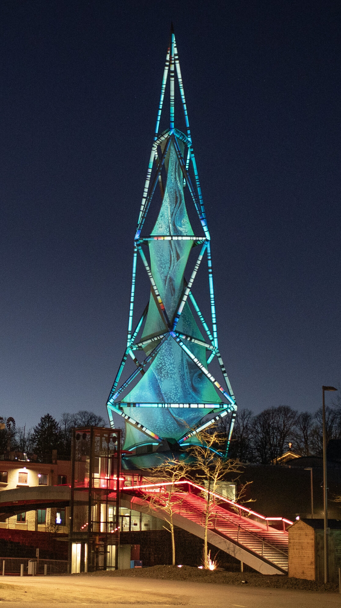Our work is called „LICHTWERK“, and it transforms the tower into a type of power plant, drawing starlight from the sky and splitting it into its spectral colors. Absorption lines reveal themselves and spread across the branched structure.