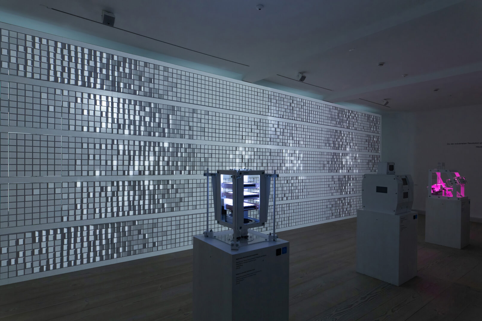 Three models in the centre of the room provide visitors with information about the processes inside the machines. The decisive factor for the spatial impression, however, is the video installation in combination with the kinetic wall, which consists of 80 moving surfaces. These square surfaces are moved by individually controllable motors whose gentle, quasi-natural movement unobtrusively modulates the daylight in the room. The reminiscence of mill blades or flowing mill streams is entirely intentional.