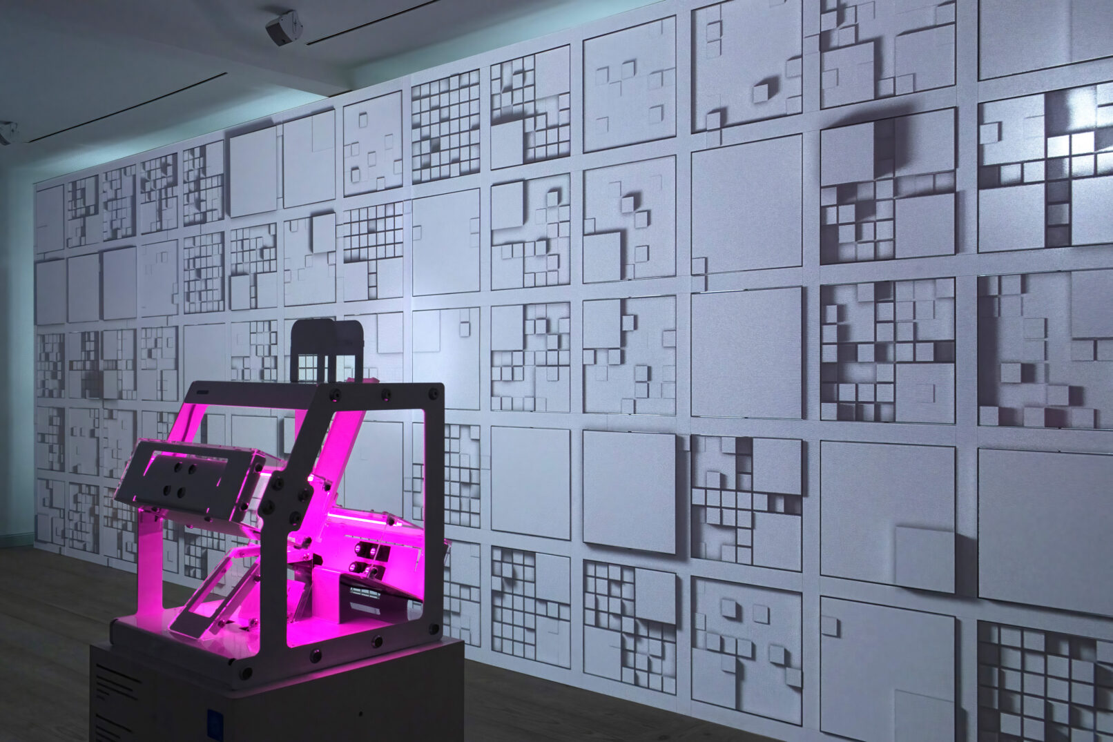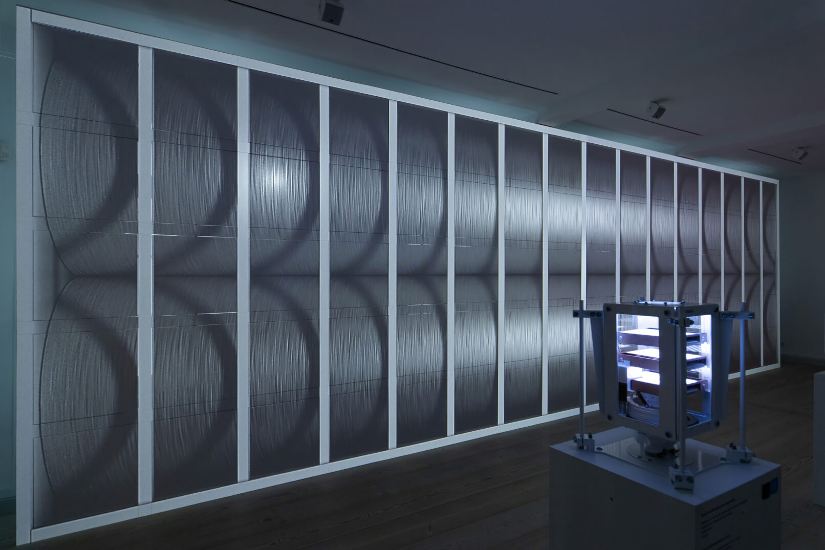 In the interplay between the movement of the kinetic surfaces, the video projection and a sound montage, the experience of the industrial mill is elevated into abstraction and conveyed emotionally. In the narrative of the process of grain processing, the individual elements of the installation intertwine so skilfully that the boundaries between the analogue and the digital become blurred. – Similar to the grain, the images of the video projection are processed in the „installation mill“ from crushing to sublimation.